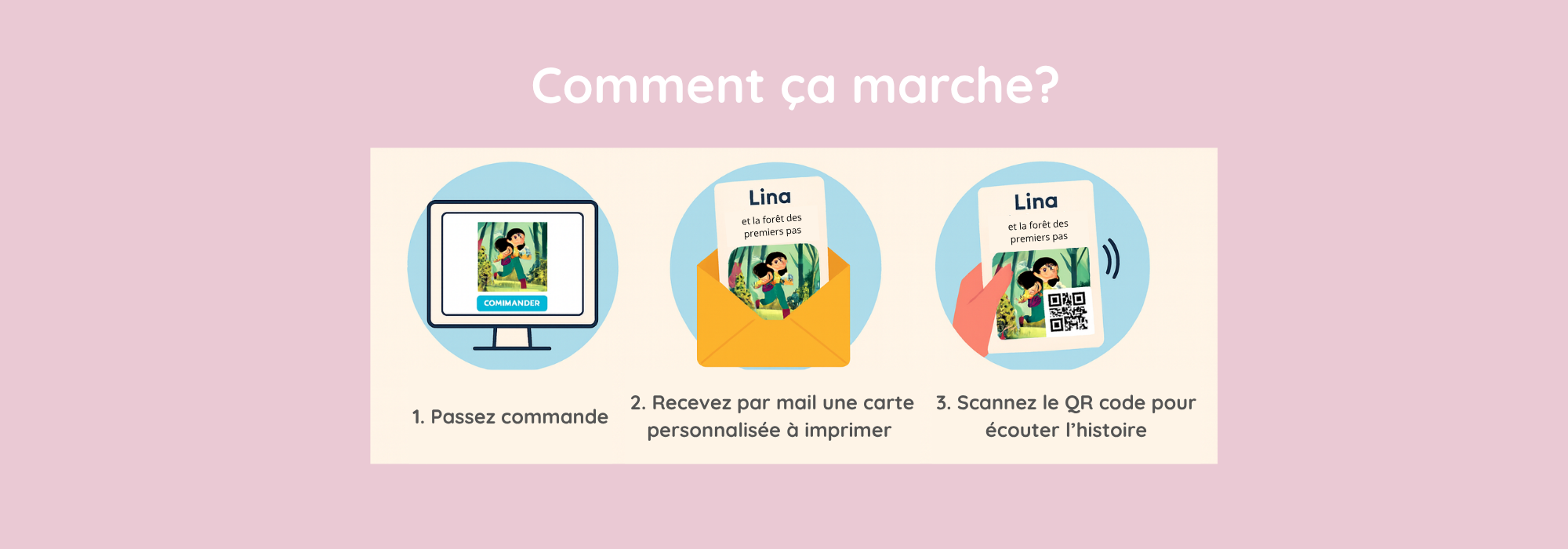 - Une carte personnalisée au prénom de votre enfant, contenant un QR code unique pour accéder à son histoire audio.